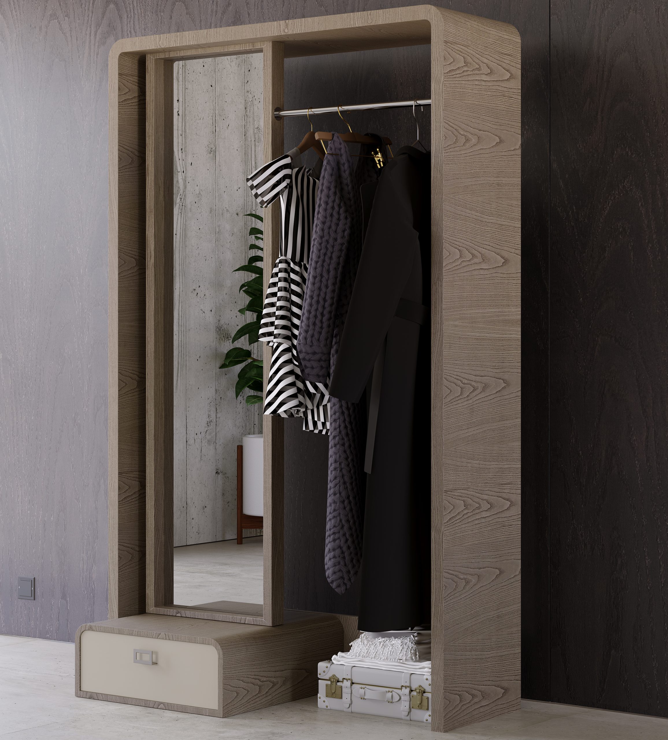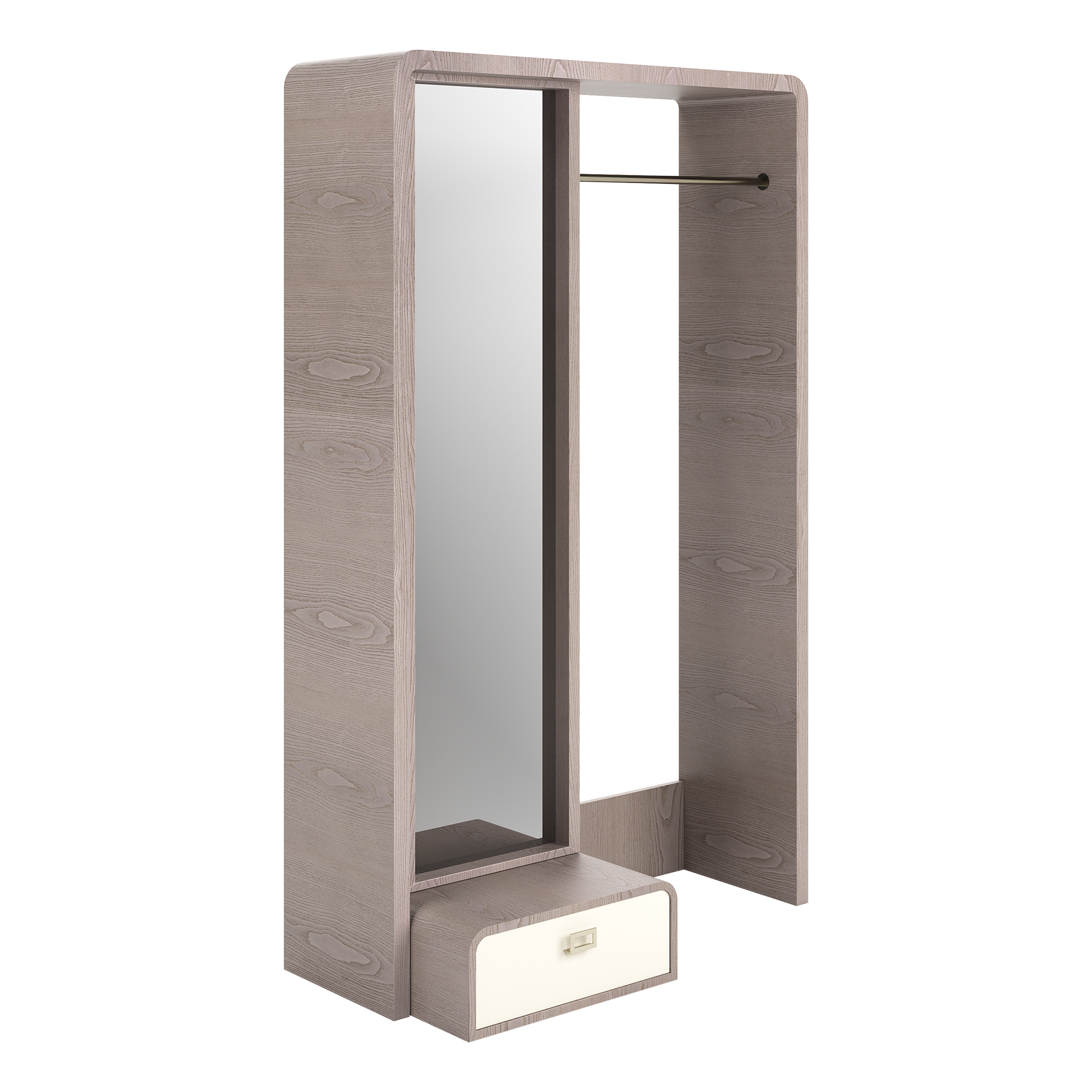 Its multiply wood structure adorned with elegant Ash Biscuit veneer creates captivating texture. With beautifully painted drawers and Champagne-finished stainless steel handles, it balances opulence and practicality. The crystal-clear mirror reflects your image and elevates your living space with timeless luxury and style. It’s more than just a mirror; it’s an artful statement of refined living.