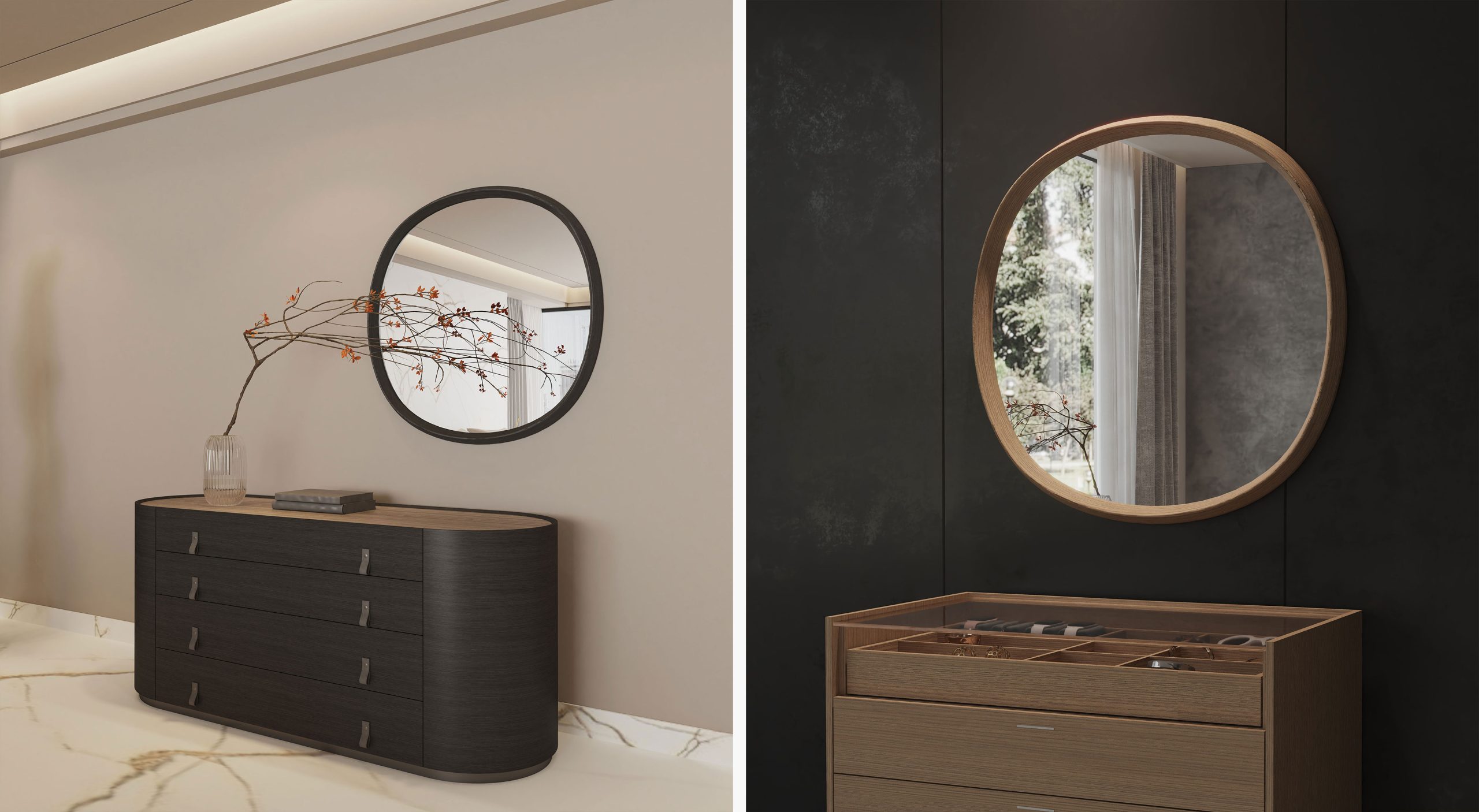 The Maru Mirror is a sophisticated accent piece that enhances the light and depth of any space.